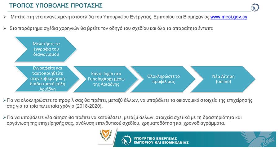 Σημειώνεται πως οι δυνητικοί δικαιούχοι θα μπορούν να υποβάλουν τις αιτήσεις τους μέσω του ηλεκτρονικού Συστήματος Σχεδίων Χορηγιών του Υπουργείου Ενέργειας, Εμπορίου και Βιομηχανίας, σε προκαθορισμένες χρονικές περιόδους, που θα ορίζονται στην πρόσκληση υποβολής προτάσεων.
