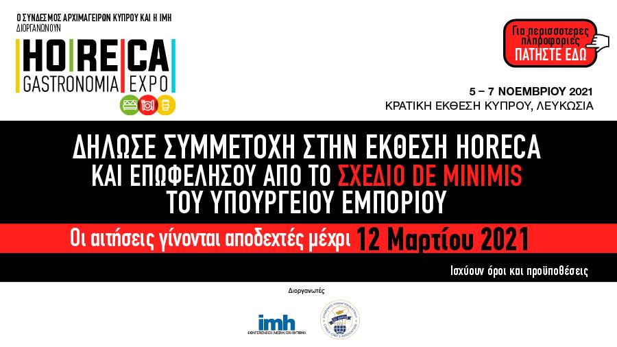 Ο Σύνδεσμος Αρχιμαγείρων Κύπρου σε συνεργασία με την IMH διοργανώνουν την HORECA-Gastronomia Expo 2021, την μεγαλύτερη έκθεση προϊόντων και υπηρεσιών που αφορούν στον εξοπλισμό και στην τροφοδοσία επιχειρήσεων οι οποίες δραστηριοποιούνται στην τουριστική βιομηχανία, καθώς και στον χώρο της μαζικής εστίασης στην Κύπρο. Η έκθεση θα πραγματοποιηθεί από τις 5 έως τις 7 Νοεμβρίου 2021, στους χώρους της Κρατικής Έκθεσης Λευκωσίας.