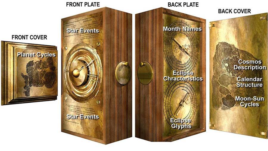 Η χρήση ακτινών-Χ από το 2005 έχει αποκαλύψει χιλιάδες χαρακτήρες κειμένου κρυμμένους μέσα στα θραύσματα. Οι επιγραφές περιλαμβάνουν μια περιγραφή του Κόσμου, με τους πλανήτες να κινούνται σε δακτυλίους. Ουσιαστικά πρόκειται για την αναπαράσταση του σύμπαντος. Δύο σημαντικές πληροφορίες που αποκαλύπτονται στο Μηχανισμό, είναι οι αριθμοί των 462 και 442 ετών, που αντιστοιχούν στους κύκλους της Αφροδίτης και του Κρόνου αντίστοιχα. Όταν παρατηρούνται από τη Γη, οι κύκλοι των πλανητών μερικές φορές αναστρέφουν την κίνηση τους σε σχέση με τα άστρα. Οι ειδικοί πρέπει να παρακολουθούν αυτούς τους μεταβαλλόμενους κύκλους (πλανητικές περιόδους) για μεγάλα χρονικά διαστήματα, προκειμένου να μπορέσουν να προβλέψουν τις θέσεις των πλανητών στο μέλλον.