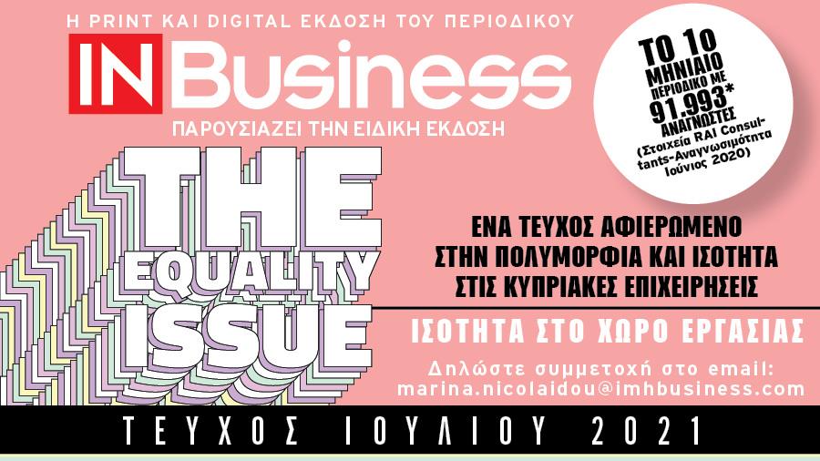 To τεύχος Ιουλίου του περιοδικού IN Business θα αποτελέσει μια ειδική έκδοση αφιερωμένη στην πολυμορφία και ισότητα στο χώρο εργασίας. Στόχος της έκδοσης είναι να προωθήσει τη σημασία των ίσων ευκαιριών στις επιχειρήσεις, ανεξάρτητα από παράγοντες φύλου, σεξουαλικότητας, εθνικότητας ή οποιασδήποτε άλλης παραμέτρου μπορεί να οδηγήσει σε άνιση μεταχείριση.