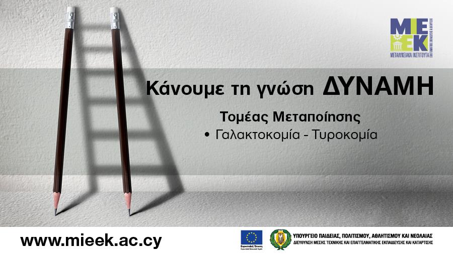 Το πρόγραμμα Γαλακτοκομίας – Τυροκομίας προσφέρεται δωρεάν από τα ΜΙΕΕΚ στην επαρχία Λευκωσίας και οι σπουδαστές/ριες οι οποίοι/ες ολοκληρώνουν επιτυχώς τη φοίτησή τους λαμβάνουν Δίπλωμα. Είναι πρόγραμμα διετούς φοίτησης το οποίο προσφέρεται στην ελληνική γλώσσα και προετοιμάζει τους σπουδαστές/ριες για σταδιοδρομία στον τομέα της Γαλακτοκομικής και Τυροκομικής Βιομηχανίας.