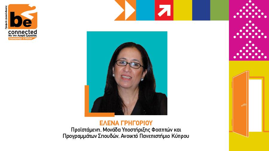 Η Έλενα Γρηγορίου είναι η Προϊστάμενη Μονάδας Υποστήριξης Φοιτητών και Προγραμμάτων Σπουδών στο ΑΠΚυ από το 2007. Είναι κάτοχος πτυχίου Mangement of Information Systems (1989) και μεταπτυχιακού ΜΒΑ (1991) από το University of Indianapolis. Έχει εμπειρία πέραν των 20 χρόνων στη διοίκηση δημόσιων Πανεπιστημίων της Κύπρου. Είναι υπεύθυνη για θέματα σπουδών (αιτήσεις, εγγραφές, αποφοιτήσεις, εξετάσεις, αρχείο φοιτητών), φοιτητικής μέριμνας (υποτροφίες, ψυχική υγεία φοιτητών, εκδηλώσεις φοιτητών) και του Γραφείου Διασύνδεσης (τοποθέτηση φοιτητών/φοιτητριών μέσω των προγραμμάτων σπουδών σε οργανισμούς και επιχειρήσεις).
