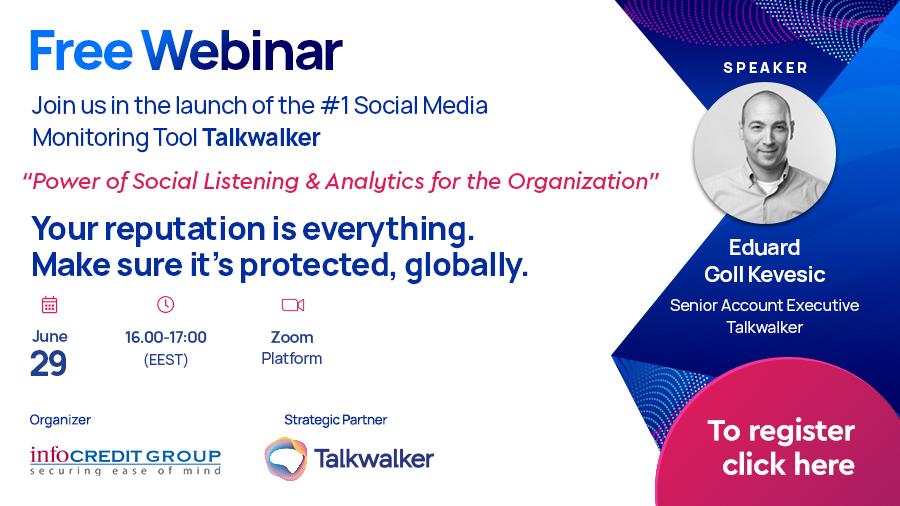 Εγγραφείτε τώρα στην διαδικτυακή παρουσίαση με θέμα "Power of Social Listening and Analytics for the Organization" που διοργανώνεται στις 29 Ιουνίου στις 16.00 (EEST) και ανακαλύψτε τα πάντα για αυτή την πρωτοποριακή πλατφόρμα που αλλάζει την πληροφόρηση και αξιολόγηση των Μέσων Κοινωνικής Δικτύωσης.