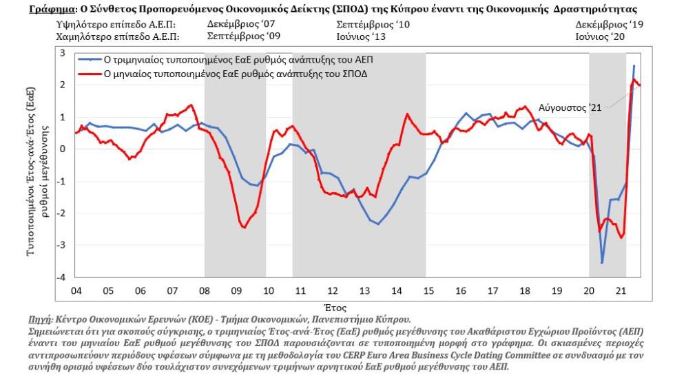 Συγκεκριμένα, ο Σύνθετος Προπορευόμενος Οικονομικός Δείκτης (ΣΠΟΔ) της Κύπρου κατέγραψε ετήσια αύξηση 10.8% τον Αύγουστο του 2021, φτάνοντας σε επίπεδο 114.1, μετά από ετήσιες αυξήσεις 11.2% τον Ιούλιο και 11.7% τον Ιούνιο (με βάση τα πιο πρόσφατα και αναθεωρημένα δεδομένα).