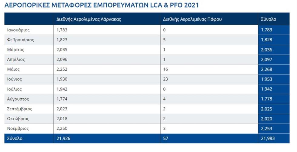 Όσον αφορά τον μήνα Νοέμβριο, το αεροδρόμιο Λάρνακας πλησίασε αρκετά το 2019, ωστόσο η Πάφος παρέμεινε σε χαμηλά ποσοστά. Συγκεκριμένα, το Νοέμβριο του 2019, ο Διεθνής Αερολιμένας Λάρνακας κατέγραψε 2,539 τόνους και ο Διεθνής Αερολιμένας Πάφου 30 τόνους. Ακολούθησε ο Νοέμβριος του 2020 με τον Διεθνή Αερολιμένα Λάρνακας στους 1,943 τόνους και το Διεθνή Αερολιμένα Πάφου σε 1 τόνο. Φέτος το Νοέμβριο ο Διεθνής Αερολιμένας Λάρνακας έφτασε τους 2,250 τόνους και ο Διεθνής Αερολιμένας Πάφου τους 3 τόνους. Σε ποσοστά και σε σύγκριση με το Νοέμβριο του 2019, φέτος ο Διεθνής Αερολιμένας Λάρνακας έπεσε κατά 11.38% και ο Διεθνής Αερολιμένας Πάφου κατά 90%.