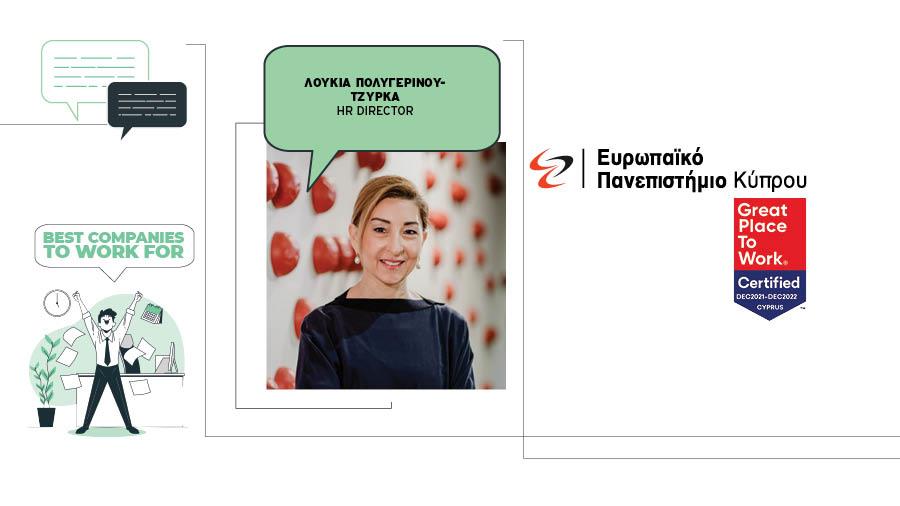 Το Ευρωπαϊκό Πανεπιστήμιο Κύπρου κατέστη το πρώτο πανεπιστήμιο που έλαβε την πιστοποίηση Great Place to Work. Για το θέμα μιλά η HR director, Λουκία Πολυγερινού-Τζύρκα.