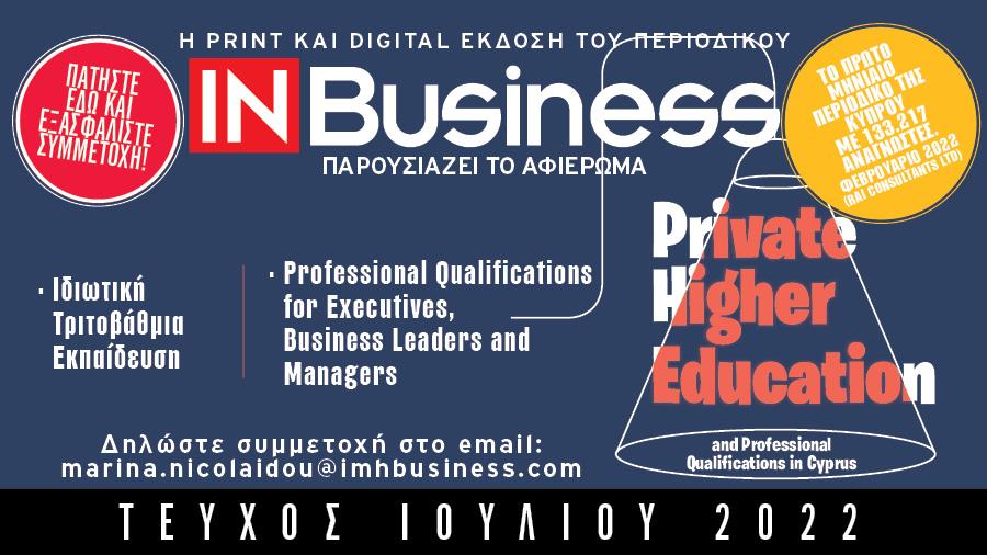 Το IN Business παρουσιάζει στο τεύχος Ιουλίου το ειδικό αφιέρωμα Private Higher Education & Professional Qualifications in Cyprus με στόχο να παρουσιάσει όλα τα σχετικά διαθέσιμα προγράμματα των κυπριακών εκπαιδευτικών οργανισμών.