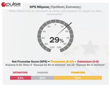 Σύμφωνα με την έρευνα, το 52% των ερωτηθέντων θα πρότεινε την μάρκα αυτοκινήτου που έχει αγοράσει, ενώ το 23% όχι, με την γενική βαθμολογία NPS (Net Promoter Score) να καταλήγει στο 29% για τον τομέα αυτοκινήτων. Η βαθμολογία αυτή καταδεικνύει τον βαθμό ικανοποίησης με την μάρκα και χρησιμοποιείται κατά την τακτική αξιολόγηση και την διαχρονική μέτρηση απόδοσης της μάρκας όσον αφορά την ικανότητα της να ανταποκρίνεται στις προσδοκίες του καταναλωτικού κοινού, συγκριτικά με τον ανταγωνισμό αλλά και τον μέσο όρο του τομέα γενικότερα.