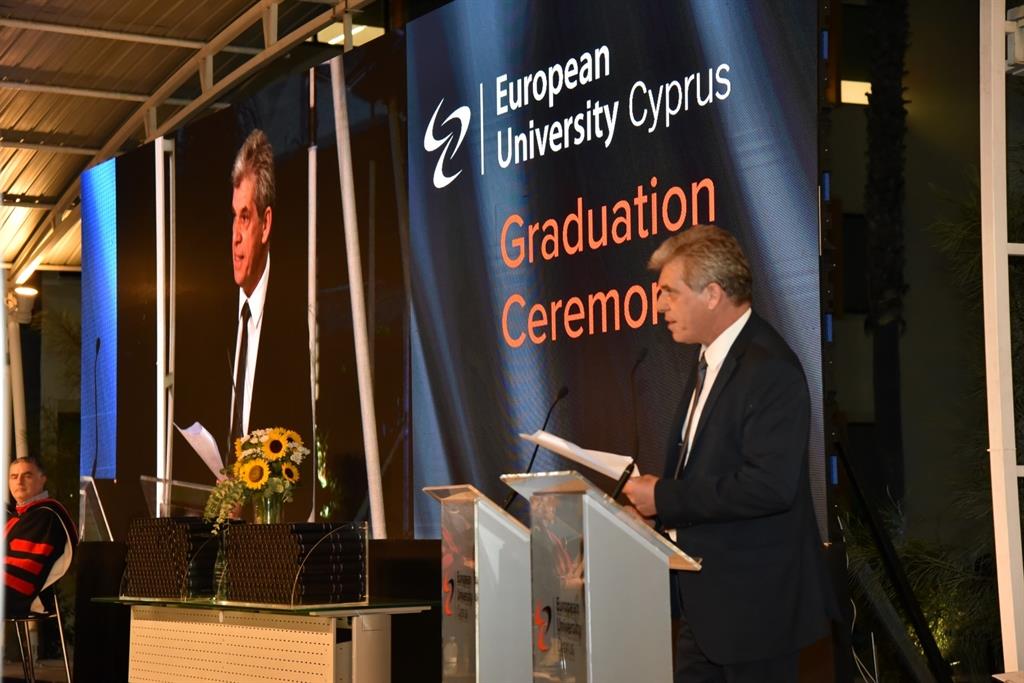 Ο Αντιπρύτανης Ακαδημαϊκών Υποθέσεων του Ευρωπαϊκού Πανεπιστημίου Κύπρου Καθηγητής Λοΐζος Συμεού απευθυνόμενος στους απόφοιτους και των δύο Σχολών επισήμανε ότι «η αποφοίτηση είναι η πιο σημαδιακή μέρα του ακαδημαϊκού ημερολογίου, καθώς είναι εκείνη η περήφανη στιγμή που όλοι και όλες μοιραζόμαστε την επιτυχία των αποφοίτων μας και ταυτόχρονα προσβλέπουμε στο μέλλον τους». Συνεχίζοντας, και αφού καλωσόρισε τις οικογένειες και τους φίλους και φίλες των αποφοίτων στην Τελετή, δήλωσε ότι «στις πολύ εξαιρετικές συνθήκες που προκλήθηκαν από την πανδημία που επηρέασε ολόκληρη την ανθρωπότητα τα τελευταία δυόμιση χρόνια, η επιτυχία των αποφοίτων μας γίνεται ακόμη πιο σημαντική» και ότι οι οικογένειες και φίλοι τους «έχουν κάθε λόγο να γιορτάζουν σήμερα μαζί τους, καθώς έπαιξαν καθοριστικό ρόλο στην υποστήριξή τους τα πολύ δύσκολα αυτά χρόνια».