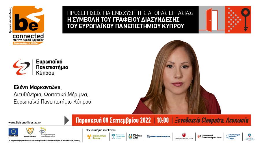 Γέφυρα που ενώνει τον επιχειρηματικό με τον φοιτητικό κόσμο αποτελεί η λειτουργία των Γραφείων Διασύνδεσης, αφού γίνονται πλέον αντιληπτές οι πραγματικές ανάγκες της αγοράς εργασίας. Η διασύνδεση της πανεπιστημιακής κοινότητας με την αγορά εργασίας, δίνει την ευκαιρία στους φοιτητές να δουν στην πράξη όλα όσα καθημερινά μαθαίνουν σε θεωρητικό επίπεδο. Την Παρασκευή 9 Σεπτεμβρίου 2022 στις 10:00 π.μ., στο Ξενοδοχείο Cleopatra, στη Λευκωσία, διοργανώνεται ημερίδα για ενημέρωση σχετικά με τις δράσεις του Γραφείου Διασύνδεσης του Ευρωπαϊκού Πανεπιστημίου Κύπρου , στο πλαίσιο του Έργου «Γραφεία Διασύνδεσης Πανεπιστημίων με την αγορά εργασίας», το οποίο συγχρηματοδοτείται από τα Διαρθρωτικά Ταμεία της Ευρωπαϊκής Ένωσης. Το Έργο συντονίζει το Πανεπιστήμιο Κύπρου και συμμετέχουν τα Πανεπιστήμια που λειτουργούν στην Κυπριακή Δημοκρατία. www.liaisonoffices.ac.cy
