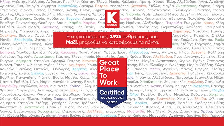 Οι άνθρωποι της εταιρείας είναι αυτοί που ανέδειξαν και πιστοποίησαν στον οργανισμό Great Place Work® Hellas, την Κωτσόβολος ως Great Place To Work®. Οι εργαζόμενοί της, κλήθηκαν να αξιολογήσουν την εταιρεία για την εργασιακή της κουλτούρα, το εργασιακό περιβάλλον, την αξιοπιστία, τον σεβασμό στον άνθρωπο, τη διαφορετικότητα, τη συντροφικότητα, την εσωτερική δικαιοσύνη και την υπερηφάνεια τους για την εταιρεία, μέσα από το ερωτηματολόγιο Trust IndexTM. Τα αποτελέσματα της έρευνας αντανακλούν τις δράσεις της εταιρείας και αποτελούν κίνητρο και δέσμευση για ακόμα περισσότερες ενέργειες γύρω από τον στόχο της Κωτσόβολος, να επενδύει συνεχώς στους ανθρώπους της.