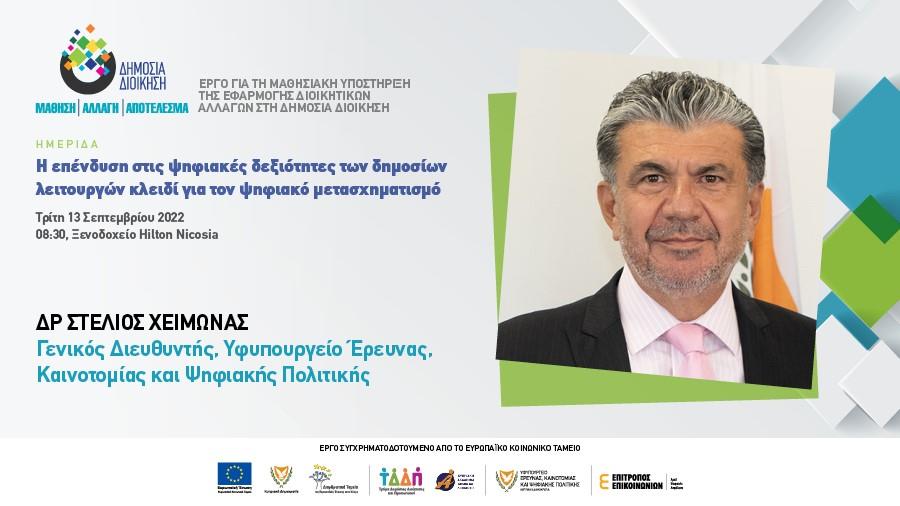 Στο πλαίσιο αυτό, η Κυπριακή Ακαδημία Δημόσιας Διοίκησης, ως ο αρμόδιος φορέας ανάπτυξης και εφαρμογής πολιτικής μάθησης στη δημόσια διοίκηση και το Υφυπουργείο Έρευνας, Καινοτομίας και Ψηφιακής Πολιτικής, ως ο αρμόδιος φορέας με οριζόντιες αρμοδιότητες επί θεμάτων ψηφιακής υφής, διοργανώνουν ημερίδα με τίτλο: «Η επένδυση στις ψηφιακές δεξιότητες των δημοσίων λειτουργών: κλειδί για τον ψηφιακό μετασχηματισμό».