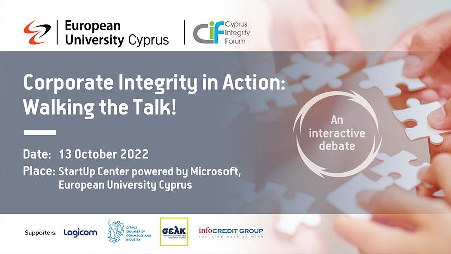 Το Ευρωπαϊκό Πανεπιστήμιο Κύπρου (EUC) και το Cyprus Integrity Forum (CIF) διοργανώνουν για πρώτη φορά στη Λευκωσία μια διαδραστική συζήτηση με τίτλο «Εταιρική Ακεραιότητα στη Δράση: Κάνοντας τη Συζήτηση Πράξη!».