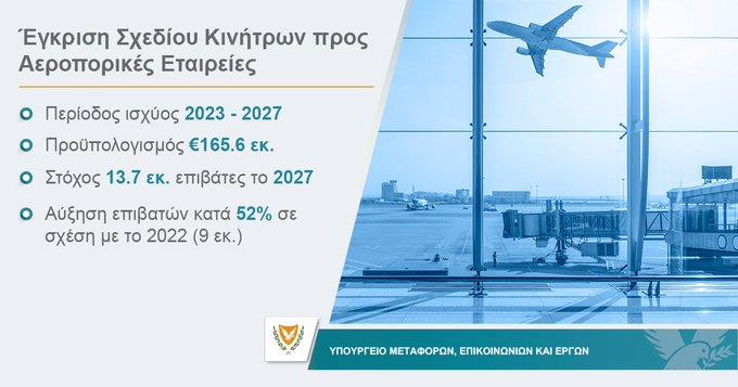 Το Σχέδιο Κινήτρων για τις αεροπορικές εταιρείες για τη χρονική περίοδο 2023 – 2027 ενέκρινε σήμερα το Υπουργικό Συμβούλιο μετά από πρόταση που υπέβαλαν από κοινού το Υπουργείο Μεταφορών, Επικοινωνιών και Έργων και το Υπουργείο Οικονομικών.