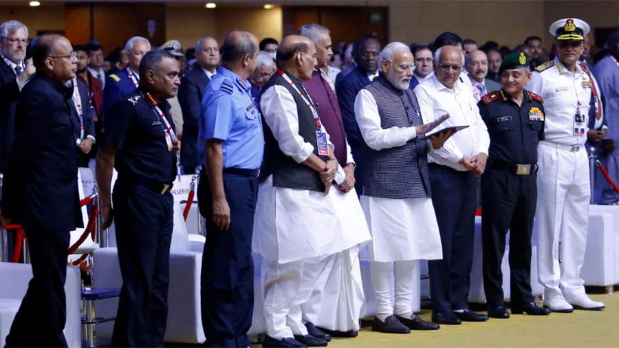 Στην έκθεση Άμυνας, ο Πρωθυπουργός παρουσίασε το ινδικής κατασκευής εκπαιδευτικό αεροσκάφος HTT-40 που σχεδιάστηκε από την Hindustan Aeronautics Limited και επίσης εγκαινίασε το Mission Defspace. Έθεσε επίσης τον θεμέλιο λίθο του αεροδρομίου της Deesa στο Gujarat το οποίο απέχει μόλις 130 χλμ. από τα σύνορα. Για την ανάγκη και τη σημασία του αεροδρομίου, ο Πρωθυπουργός είπε: «Εάν οι δυνάμεις μας, ειδικά η Πολεμική Αεροπορία μας είναι παρούσες στη Deesa, θα μπορέσουμε να ανταποκριθούμε καλύτερα σε οποιαδήποτε κρίση προκύψει στα δυτικά σύνορα».