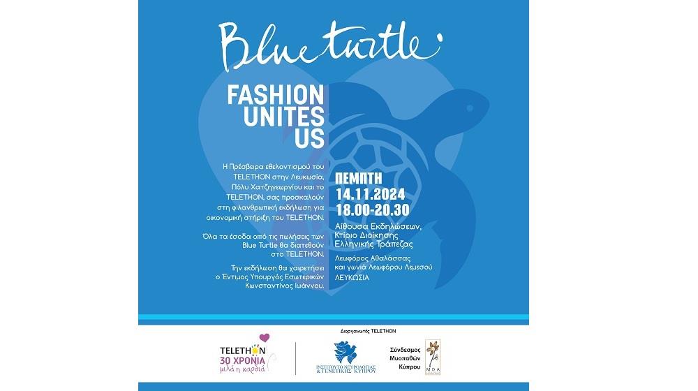 Σε μια ξεχωριστή εκδήλωση, που συνδυάζει τη μόδα με την κοινωνική προσφορά, η Πρέσβειρα Εθελοντισμού του TELETHON στη Λευκωσία, κυρία Πόλυ Χατζηγεωργίου, θα παρουσιάσει τη νέα συλλογή του brand της, «Blue Turtle», σε μια ξεχωριστή εκδήλωση η οποία θα έχει στόχο την οικονομική ενίσχυση του φιλανθρωπικού θεσμού.