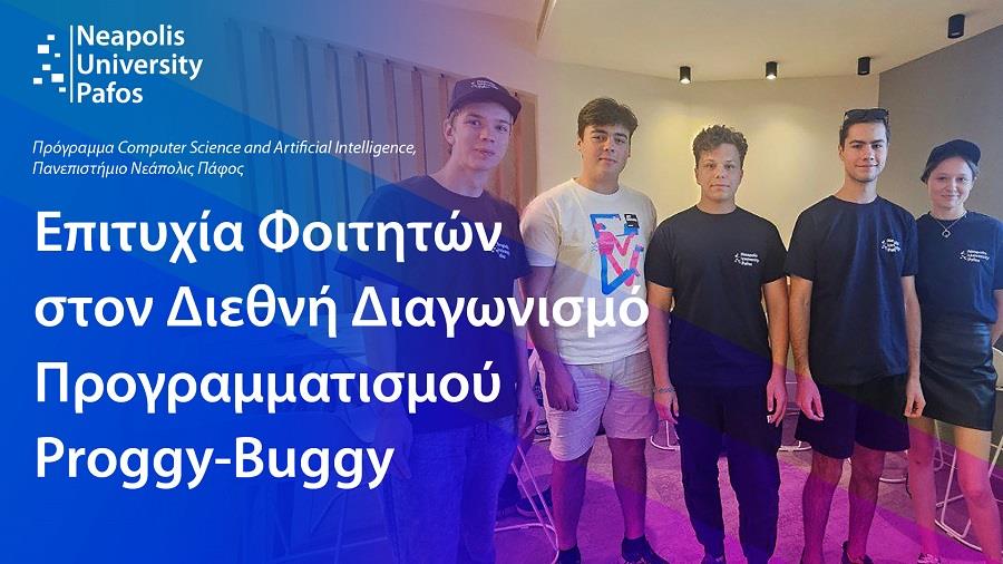 Το Πανεπιστήμιο Νεάπολις Πάφος, επιβεβαιώνοντας τη δέσμευσή του στην αριστεία και στην υψηλού επιπέδου εκπαίδευση, συγχαίρει θερμά την ομάδα πέντε πρωτοετών φοιτητών από το πρόγραμμα «Πληροφορικής και Τεχνητής Νοημοσύνης» για την εξαιρετική τους επίδοση στον διεθνή διαγωνισμό προγραμματισμού Proggy-Buggy.