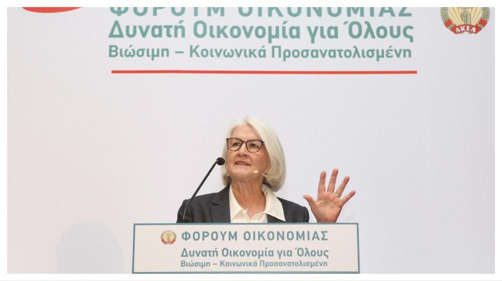 Η Ann Pettifor μιλούσε στο 3ο Φόρουμ Οικονομίας με τίτλο «Δυνατή Οικονομία για Όλους: Βιώσιμη – Κοινωνικά Προσανατολισμένη» που διοργάνωσε το ΑΚΕΛ.