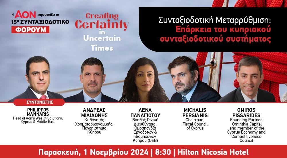 Το 15ο Συνταξιοδοτικό Φόρουμ θα εξετάσει τις πιο πρόσφατες εξελίξεις, τις στρατηγικές συμμόρφωσης, καθώς και τα βήματα που πρέπει να γίνουν για να διασφαλιστεί η βιωσιμότητα και η ανάπτυξη των συνταξιοδοτικών ταμείων στην Κύπρο και στο εξωτερικό.