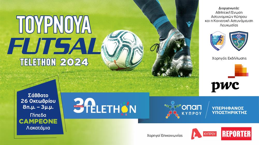 Διοργανωτές του «Τουρνουά Φούτσαλ TELETHON 2024» είναι η Αθλητική Ένωση Αστυνομικών Κύπρου (ΑΕΑΚ), και η Κοινοτική Αστυνόμευση Λευκωσίας και αποτελεί έναν από τους ετήσιους θεσμούς στήριξης του TELETHON.