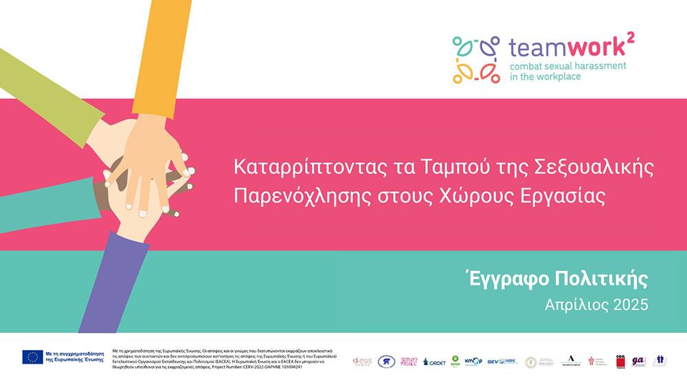 Για δύο χρόνια, το ευρωπαϊκό έργο TEAMWORK 2 άνοιξε τον διάλογο, επαναφέροντας στην επιφάνεια ένα θέμα που για χρόνια παρέμενε ταμπού: τη σεξουαλική παρενόχληση στον εργασιακό χώρο! Με τη συμμετοχή έξι χωρών, ανάμεσά τους και η Κύπρος, και με τη στήριξη της Ευρωπαϊκής Ένωσης, το έργο ένωσε φωνές, εμπειρίες και καλές πρακτικές για να διαμορφώσει ένα νέο, ασφαλέστερο εργασιακό περιβάλλον για όλους.