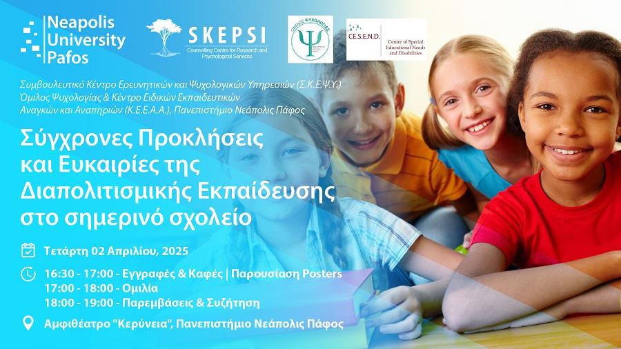 Το Πανεπιστήμιο Νεάπολις Πάφος διοργανώνει επιστημονική εκδήλωση με θέμα τη διαπολιτισμική εκπαίδευση και τη σημασία της για το σημερινό σχολείο, την Τετάρτη 2 Απριλίου 2025, από τις 16:30 έως τις 19:00, στο Αμφιθέατρο «Κερύνεια».