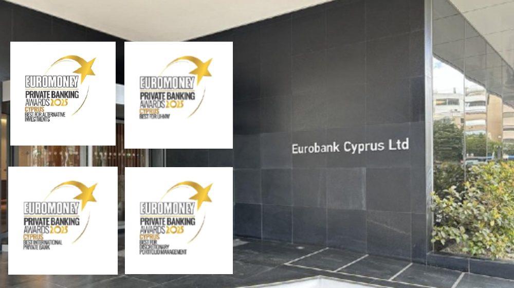 Κατά την τελετή βράβευσης στα Euromoney Private Banking Awards 2025, που πραγματοποιήθηκαν στις 27 Μαρτίου στο Λονδίνο, η Eurobank Κύπρου απέσπασε τέσσερα συνολικά βραβεία στις κατηγορίες: Cyprus' Best International Private Bank, Cyprus' Best for UHNW (Ultra-High Net Worth), Cyprus' Best for Discretionary Portfolio Management και Cyprus' Best for Alternative Investments.