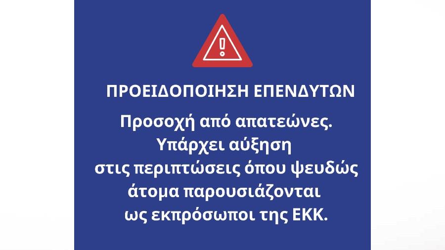 Τα πρόσωπα αυτά παρουσιάζονται με δόλιο τρόπο ως λειτουργοί ή εκπρόσωποί της ΕΚΚ και προσεγγίζουν επενδυτές αξιώνοντας την καταβολή αμοιβής ως αντάλλαγμα για δήθεν διευθέτηση ανάκτησης ζημιών που υπέστησαν οι επενδυτές στο πλαίσιο της συνεργασίας τους με οντότητες που βρίσκονται υπό την εποπτεία της ΕΚΚ.