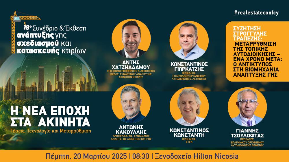 Το 19ο Συνέδριο και Έκθεση Ανάπτυξης Γης, Σχεδιασμού και Κατασκευής Κτιρίων, που πραγματοποιείται την Πέμπτη, 20 Μαρτίου 2025, στο Hilton Λευκωσίας, αποτελεί την κορυφαία ετήσια συνάντηση των επιχειρηματιών του τομέα των ακινήτων και της κατασκευής στην Κύπρο και περιλαμβάνει το κρίσιμο αυτό ζήτημα με πρωταγωνιστές της να εκφράζουν θέσεις και απόψεις.