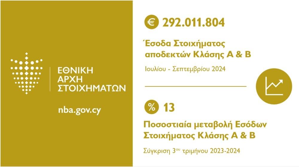 Σύμφωνα με τα οικονομικά αποτελέσματα που ανακοίνωσε η Εθνική Αρχή Στοιχημάτων για το γ’ τρίμηνο του 2024 (Ιούλιος-Σεπτέμβριος 2024), τα έσοδα στοιχήματος αποδεκτών Κλάσης Α (επίγειο στοίχημα) και Κλάσης Β (διαδικτυακό στοίχημα) ανήλθαν στα €292.011.804, σημειώνοντας αύξηση 13% σε σύγκριση με την αντίστοιχη περίοδο του 2023.