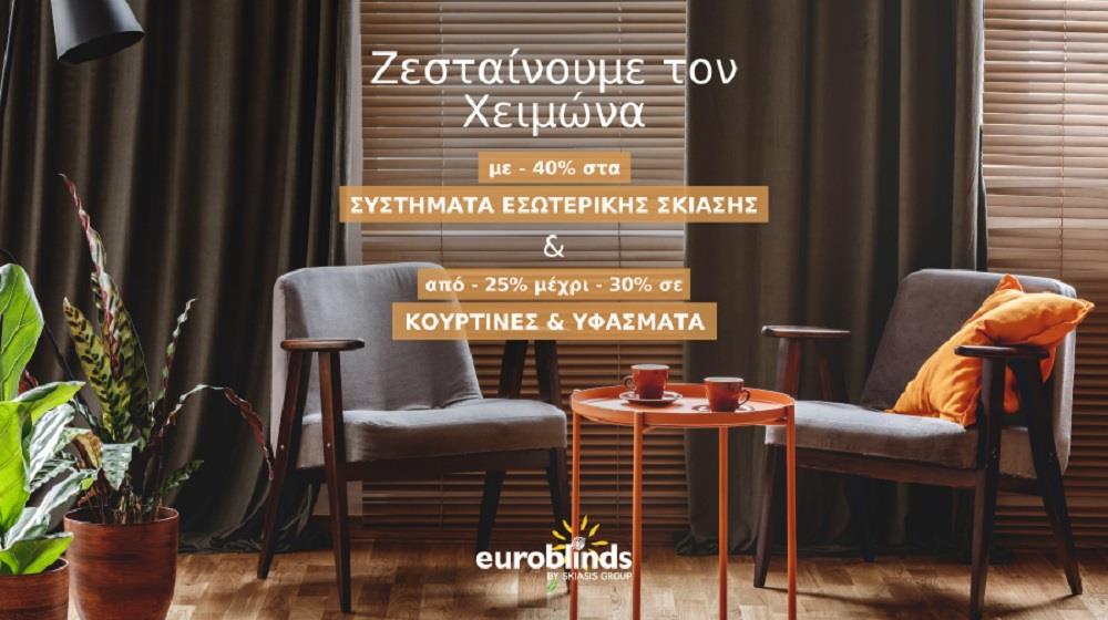 Η Euroblinds ζεσταίνει τον Χειμώνα με -40% έκπτωση σε όλα τα συστήματα εσωτερικής σκίασης και με -25% έως -30% σε κουρτίνες και υφάσματα.