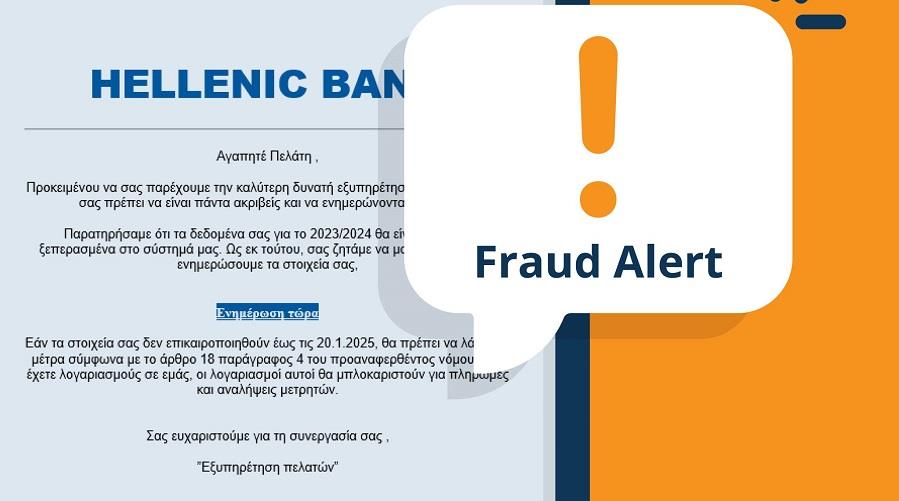 Η Ελληνική Τράπεζα εντείνει τις προσπάθειές της για ασφάλεια των πελατών της και των συναλλαγών τους. Σε αυτό το πλαίσιο υπενθυμίζει: Δεν θα ζητήσουμε ΠΟΤΕ από τους πελάτες μας να επικαιροποιήσουν τα στοιχεία τους ή να αποκαλύψουν ευαίσθητα προσωπικά δεδομένα μέσω συνδέσμου.