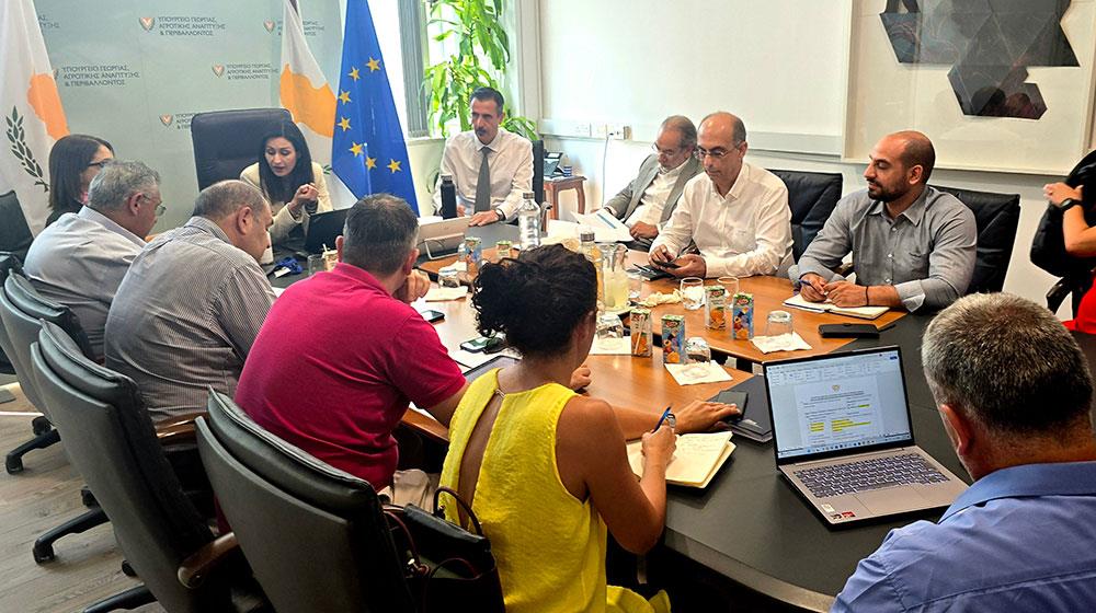 Τη στήριξη των επιχειρήσεων για την υιοθέτηση πιο βιώσιμων και φιλικών προς το περιβάλλον πρακτικών, στο πλαίσιο της πράσινης μετάβασης και της αειφόρου ανάπτυξης, συζήτησε η Υπουργός Γεωργίας, Αγροτικής Ανάπτυξης και Περιβάλλοντος, Δρ. Μαρία Παναγιώτου, με εκπροσώπους του Κυπριακού Εμπορικού και Βιομηχανικού Επιμελητήριου (ΚΕΒΕ) και της Ομοσπονδίας Εργοδοτών & Βιομηχάνων (ΟΕΒ).