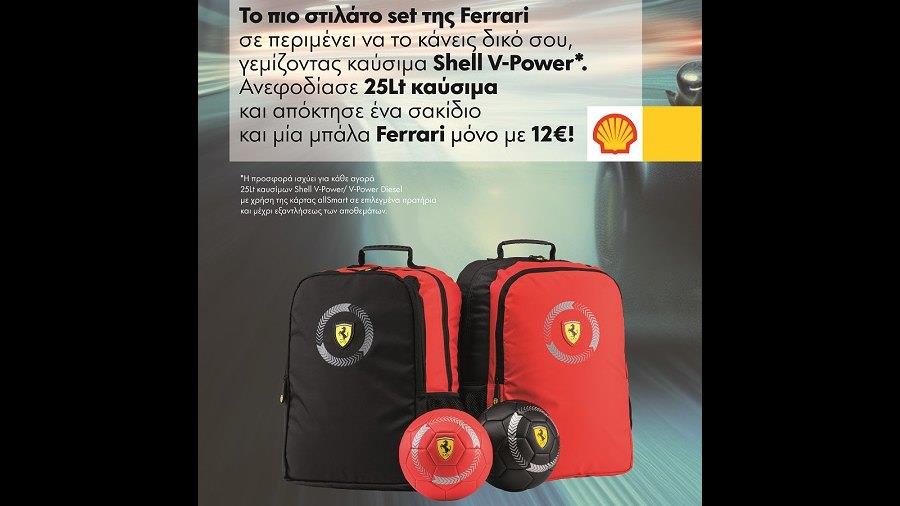Συγκεκριμένα, κάθε καταναλωτής που επιλέγει τα πρατήρια καυσίμων Shell για τον ανεφοδιασμό του οχήματός του, έχει τη δυνατότητα να αποκτήσει ένα αυθεντικό σακίδιο πλάτης και μία μπάλα Ferrari στην προνομιακή τιμή των 12€.