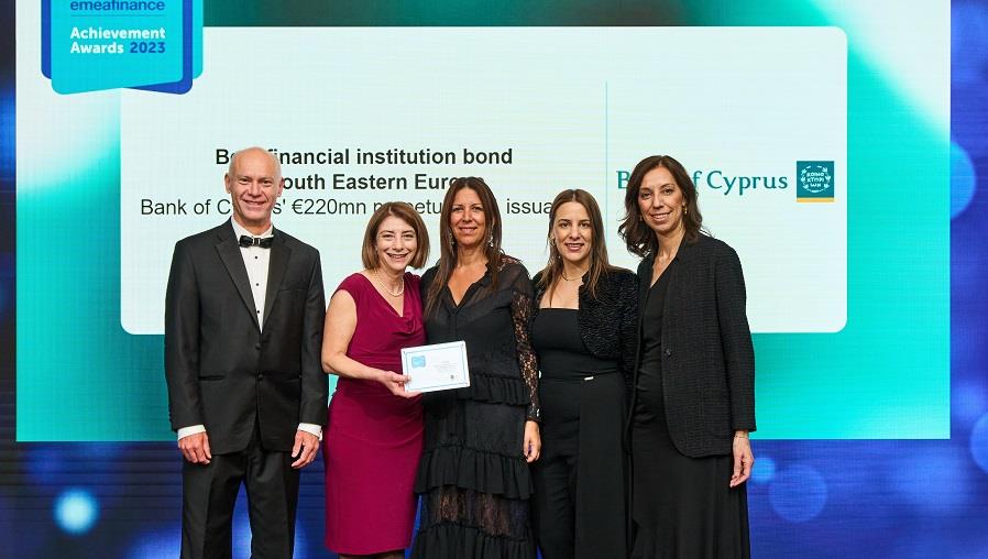 Το EMEA Finance απένειμε στην Τράπεζα Κύπρου το βραβείο για το Καλύτερο Ομόλογο Χρηματοπιστωτικού Ιδρύματος στη Νοτιοανατολική Ευρώπη στα Βραβεία Επιτευγμάτων 2023 για την άκρως επιτυχημένη έκδοση Χρεογράφων Πρόσθετου Κεφαλαίου Κατηγορίας 1 (AT1) ύψους 220 εκατ. ευρώ τον Ιούνιο του 2023.