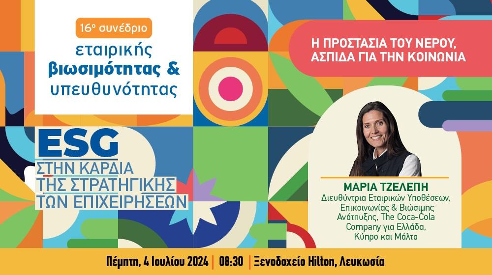 Στο 16ο Συνέδριο για την Εταιρική Βιωσιμότητα & Υπευθυνότητα που πραγματοποιείται αυτό τον μήνα, οι σύνεδροι θα έχουν την ευκαιρία να ακούσουν την Μαρία Τζελέπη, Διευθύντρια Εταιρικών Υποθέσεων, Επικοινωνίας & Βιώσιμης Ανάπτυξης, The Coca-Cola Company για Ελλάδα, Κύπρο και Μάλτα να μιλά για όλα τα πιο πάνω. Η ομιλία της κ.Τζελέπη έχε τον τίτλο «Η προστασία του Νερού, ασπίδα για την κοινωνία».