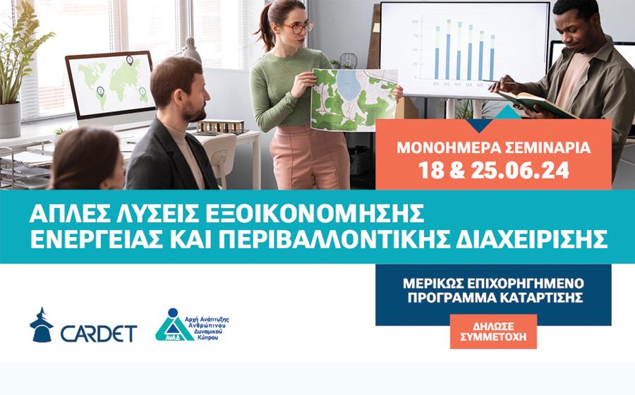 Το ερευνητικό κέντρο CARDET ανακοινώνει την προσφορά ενός νέου και μερικώς επιχορηγούμενου από την ΑνΑΔ προγράμματος κατάρτισης το οποίο θα παρουσιάσει “Απλές Λύσεις Εξοικονόμησης Ενέργειας και Περιβαλλοντικής Διαχείρισης”.