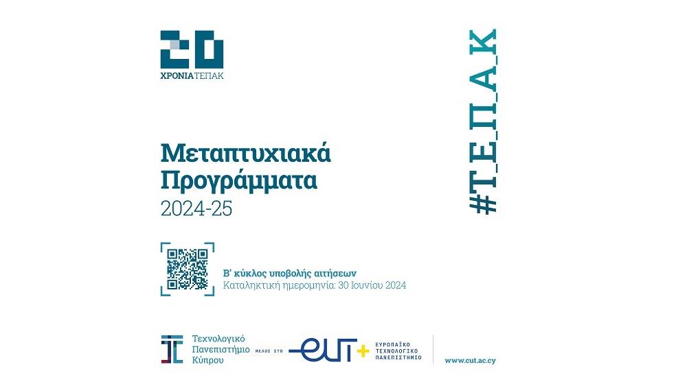 Το Τεχνολογικό Πανεπιστήμιο Κύπρου (ΤΕΠΑΚ) ανακοινώνει την έναρξη του Β’ Κύκλου υποβολής αιτήσεων για μεταπτυχιακές σπουδές, επιπέδου Μάστερ, με έναρξη φοίτησης τον Σεπτέμβριο του 2024.