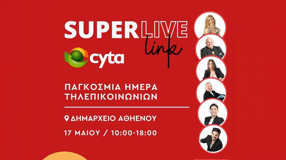 Δώστε το παρών σας σήμερα στην Αθηένου και γιορτάστε μαζί την Cyta και τον Super FM την Παγκόσμια Ημέρα Τηλεπικοινωνιών ή μείνετε συντονισμένοι στις συχνότητες του σταθμού(104.8 ή 95.7 ή 103.4) για να ακούσετε όλα όσα θα συμβούν στο ξεχωριστό αυτό ολοήμερο live link.