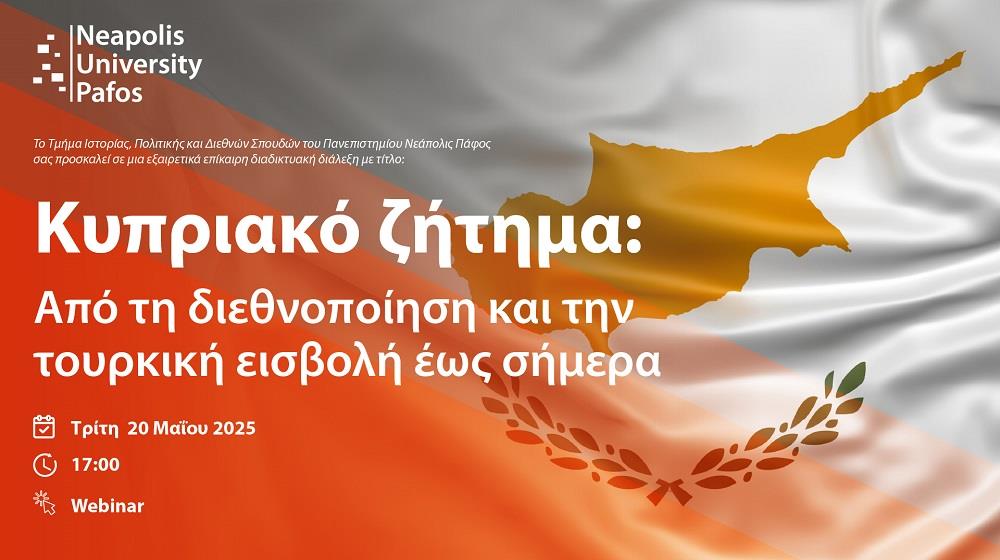 Το Τμήμα Ιστορίας, Πολιτικής και Διεθνών Σπουδών του Πανεπιστημίου Νεάπολις Πάφος διοργανώνει μια σημαντική διαδικτυακή διάλεξη με θέμα τις εξελίξεις και τις μεταμορφώσεις του Κυπριακού Ζητήματος από την περίοδο της τουρκικής εισβολής μέχρι και τη σύγχρονη γεωπολιτική πραγματικότητα.