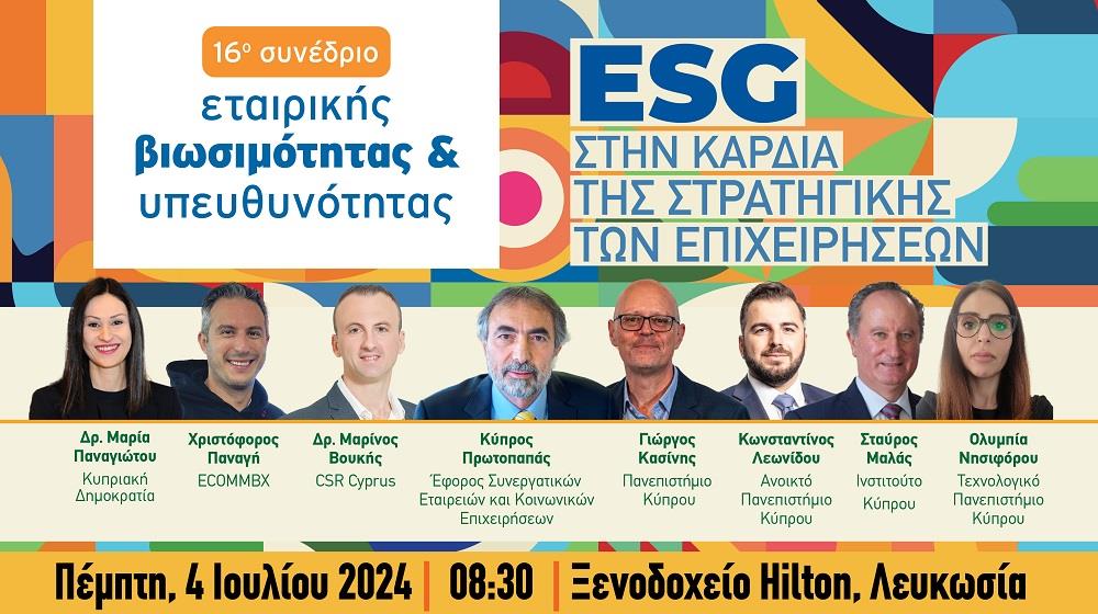 Το 16ο Συνέδριο για την Εταιρική Βιωσιμότητα & Υπευθυνότητα, η πιο ολοκληρωμένη ετήσια σύναξη επιχειρήσεων και στελεχών που υλοποιούν δράσεις Εταιρικής Κοινωνικής Ευθύνης, πραγματοποιείται στις 4 Ιουλίου στη Λευκωσία και ετοιμάζεται για άλλη μια χρονιά να συγκεντρώσει ανθρώπους που χαράζουν τη στρατηγική για μακροχρόνια Εταιρική Βιωσιμότητα, εφαρμόζοντας αρχές των κριτηρίων ESG.