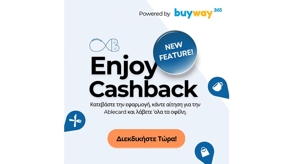 Η συνεργασία μεταξύ της Ablebook και της Buyway365 αφορά την υπηρεσία Cashback μέσω της πλατφόρμας AbleCard. Συγκεκριμένα, η Ablebook παρέχει μια υπηρεσία εντός της εφαρμογής Ablebook που ονομάζεται AbleCard. Το AbleCard είναι μια κάρτα μέλους αποκλειστικά για άτομα με αναπηρίες (ΑμεΑ), όπου οι επιχειρήσεις που παρουσιάζονται στην εφαρμογή προσφέρουν επιπλέον προνόμια σε αυτά.