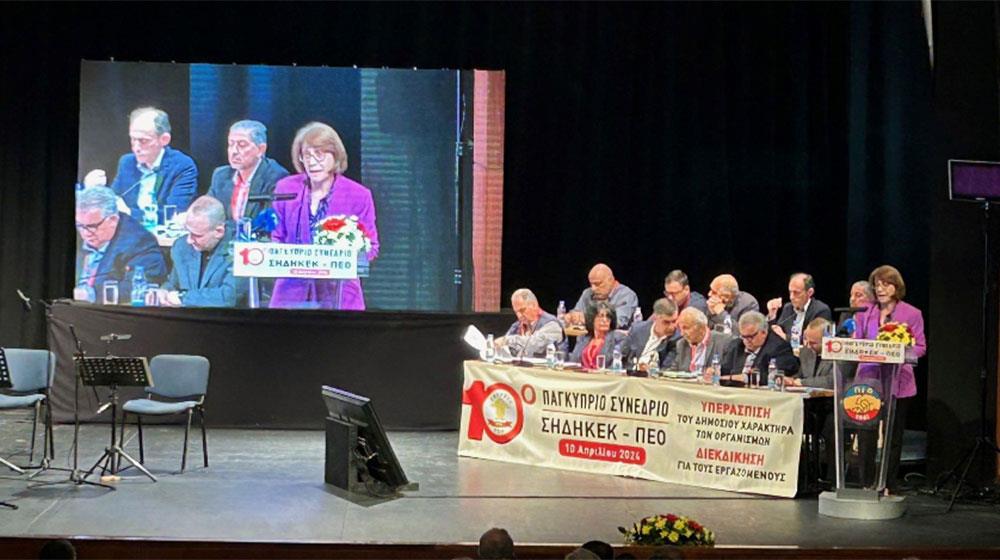 Το 10ο Παγκύπριο Συνέδριο της ΣΗΔΗΚΕΚ-ΠΕΟ άρχισε τις εργασίες του το πρωί της Τετάρτης στο Δημοτικό Θέατρο Λατσιών με τη συμμετοχή εργαζομένων, αντιπροσωπειών από το εξωτερικό και επίσημων καλεσμένων. Στο Συνέδριο έγινε απολογισμός και συζήτηση για τη δράση και τα αποτελέσματα της Συντεχνίας την τελευταία 5ετία στους Οργανισμούς Τοπικής Αυτοδιοίκησης και Ημικρατικούς Οργανισμούς που δραστηριοποιείται ενώ αποφασίστηκαν οι στόχοι και οι τρόποι επίτευξης τους για το επόμενο χρονικό διάστημα. Από το Συνέδριο, το οποίο είναι χωρισμένο σε 5 ενότητες, θα προκύψει μέσα από εκλογές το νέο Διοικητικό Συμβούλιο της ΣΗΔΗΚΕΚ-ΠΕΟ.