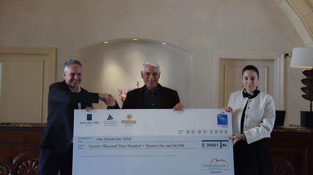 Σε μια σεμνή τελετή που πραγματοποιήθηκε τη Δευτέρα 4 Μαρτίου στο Aphrodite Hills Resort παραδόθηκε στον πρόεδρο του Παγκύπριου Συνδέσμου για παιδιά με καρκίνο και συναφείς παθήσεις «Ένα Όνειρο Μια Ευχή» κ. Γιώργο Πενηνταέξ, επιταγή ύψους €20.421, που αφορούσε χρηματικό ποσό που συγκεντρώθηκε τον Δεκέμβριο του 2023.