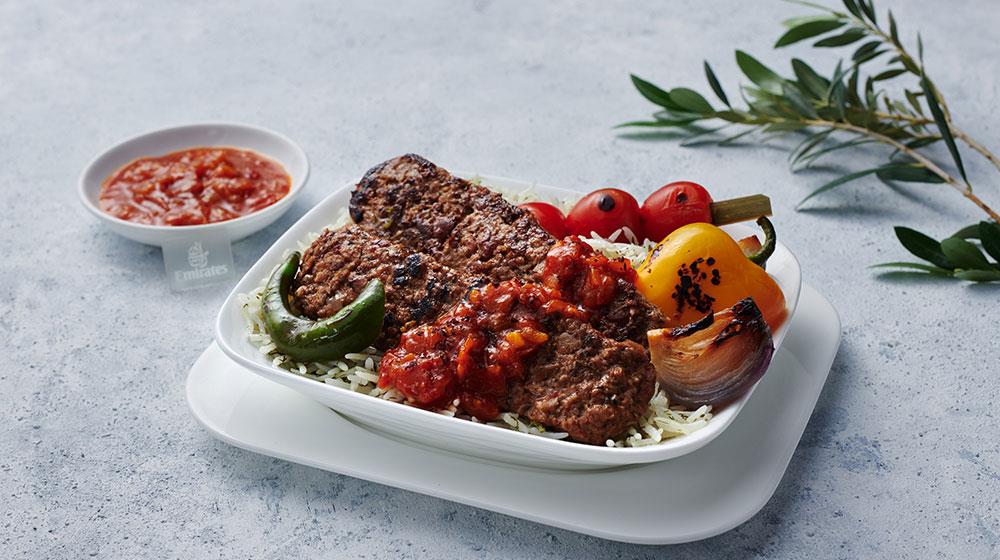 Στην Οικονομική θέση, οι επιβάτες της Emirates μπορούν να απολαύσουν πιάτα, όπως κρέπες ρεβιθιού γεμιστές με καρότο, πιπεριές, μανιτάρια και ντομάτα κονσκασέ, φριτάτα με κολοκύθα, κοτόπουλο τίκα μασάλα με τόφου, ρεβίθια στιφάδο και ρύζι πιλάφι με μαιντανό και σπανάκι baby. Τα γεύματα συνοδεύονται από πεντανόστιμα επιδόρπια, όπως μους καρύδας με κομπόστα μάνγκο, ζουμερό κέικ μπανάνας με κομμάτια σοκολάτας ή λαχταριστή πουτίγκα σοκολάτας με κακάο.