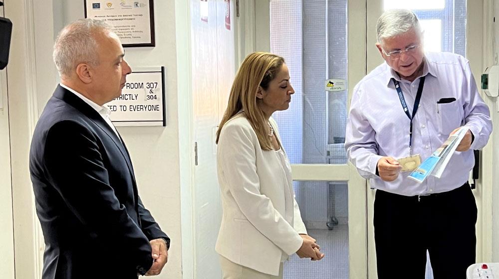 Η Υπουργός συναντήθηκε με τον Γενικό Εκτελεστικό Διευθυντή και Ιατρικό Διευθυντή του ΙΝΓΚ, Καθ. Λεωνίδα Φυλακτού και τον Καθ. Μάριο Καριόλου, Διευθυντή του Τμήματος Καρδιαγγειακής Γενετικής και Διευθυντή του Εργαστηρίου Δικανικής Γενετικής και ενημερώθηκε για τις θεματικές δραστηριοποίησης του Ινστιτούτου, και στη συνέχεια ο Καθ. Καριόλου, αναφέρθηκε στους πυλώνες δραστηριοποίησης του Εργαστηρίου Δικανικής Γενετικής, επισημαίνοντας την πολύ καλή συνεργασία που υπάρχει με την Αστυνομία Κύπρου, όσον αναφορά την εξέταση αστυνομικών τεκμηρίων.