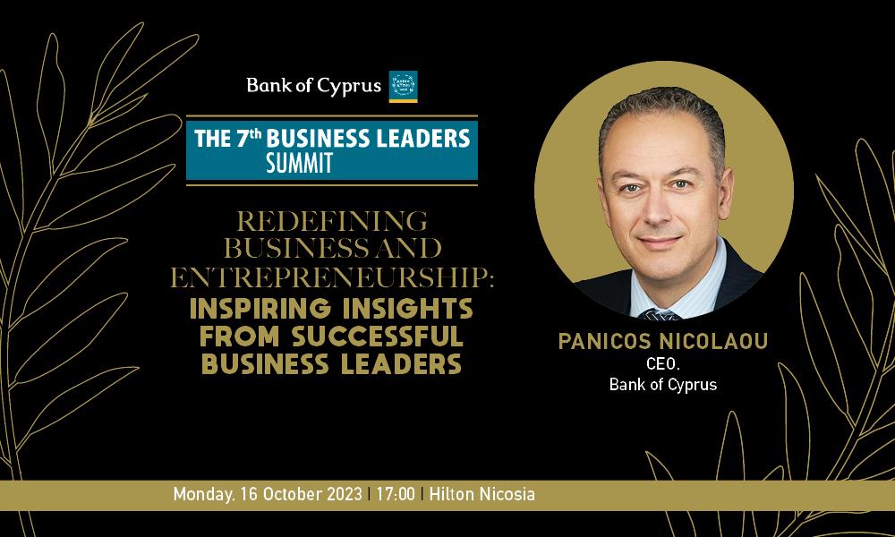 Τα ζητήματα και τις προκλήσεις που αντιμετωπίζουν οι σύγχρονοι ηγέτες επιχειρήσεων φέρνει στο φως το Business Leaders Summit η μεγαλύτερη και πιο σημαντική στο είδος της συγκέντρωση επιχειρηματικών ηγετών στην Κύπρο, που διοργανώνει η Τράπεζα Κύπρου. Συγκέντρωση στην οποία ομιλία θα πραγματοποιήσει ο Διευθύνων Σύμβουλος του ιδρύματος, Πανίκος Νικολάου.