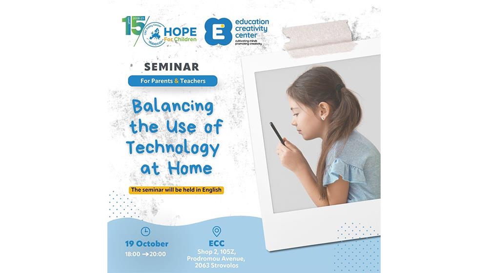 Το σεμινάριο "Εξισορροπώντας τη χρήση της τεχνολογίας στο σπίτι" που διοργανώνει το Education Creativity Centre (ECC) σε συνεργασία με το Hope For Children" CRC Policy Center, έχει ως στόχο να παράσχει πολύτιμες γνώσεις σχετικά με τα οφέλη της ελεγχόμενης χρήσης της τεχνολογίας από την οικογένεια, ενώ παράλληλα διαπραγματεύεται τους πιθανούς κινδύνους που σχετίζονται με την υπερβολική έκθεση στην οθόνη. Η εκδήλωση περιλαμβάνει συζήτηση στρογγυλής τραπέζης, με στόχο την αλληλεπίδραση συμμετεχόντων από διαφορετικά υπόβαθρα, αλλά με τον κοινό στόχο της προώθησης μιας ισορροπημένης ενσωμάτωσης της τεχνολογίας στη ζωή των παιδιών μας. Αναγνωρίζοντας τη σημασία αυτής της ισορροπίας, το σεμινάριο θα εμβαθύνει σε πρακτικές στρατηγικές για τους γονείς και φροντιστές παιδιών, ώστε να μπορέσουν διασφαλίσουν ότι τα παιδιά μπορούν να αξιοποιήσουν τα οφέλη της τεχνολογίας, διατηρώντας παράλληλα μια ισχυρή σύνδεση με τις φυσικές και κοινωνικές πτυχές της ζωής τους.