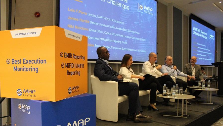 Μετά το πέρας των παρεμβάσεων ακολούθησε ανοιχτή συζήτηση με τον κ. James Hardie (Director UnaVista Product, London Stock Exchange Group) την κα. Νίκη Νικολάου (Ανώτερη Λειτουργός της Επιτροπής Κεφαλαιαγοράς Κύπρου), τον κ. Eric Odotei (Group Head of Regulatory, Finalto) και τον κ. Γιώργο Μαρκίδη (Senior Manager, Compliance Support Department, MAP S.Platis).