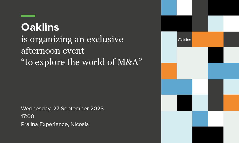Εκδήλωση με θέμα τις Συγχωνεύσεις και τις Εξαγορές διοργανώνει η Oaklins. Η εταιρεία που εξειδικεύεται στις εξαγορές και συγχωνεύσεις εταιρειών, στην ανάπτυξη κεφαλαίων, στις συμβουλευτικές υπηρεσίες χρέους και στις υπηρεσίες εταιρικής χρηματοδότησης, με ένα δυναμικό που ξεπερνά τους 850 επαγγελματίες, σε πέραν των 60 γραφείων στις 45 χώρες, θα πραγματοποιήσει την Τετάρτη, 27 Σεπτεμβρίου 2023, στο Pralina Experience στη Λευκωσία, την εκδήλωση, με θέμα “explore the world of M&A”.